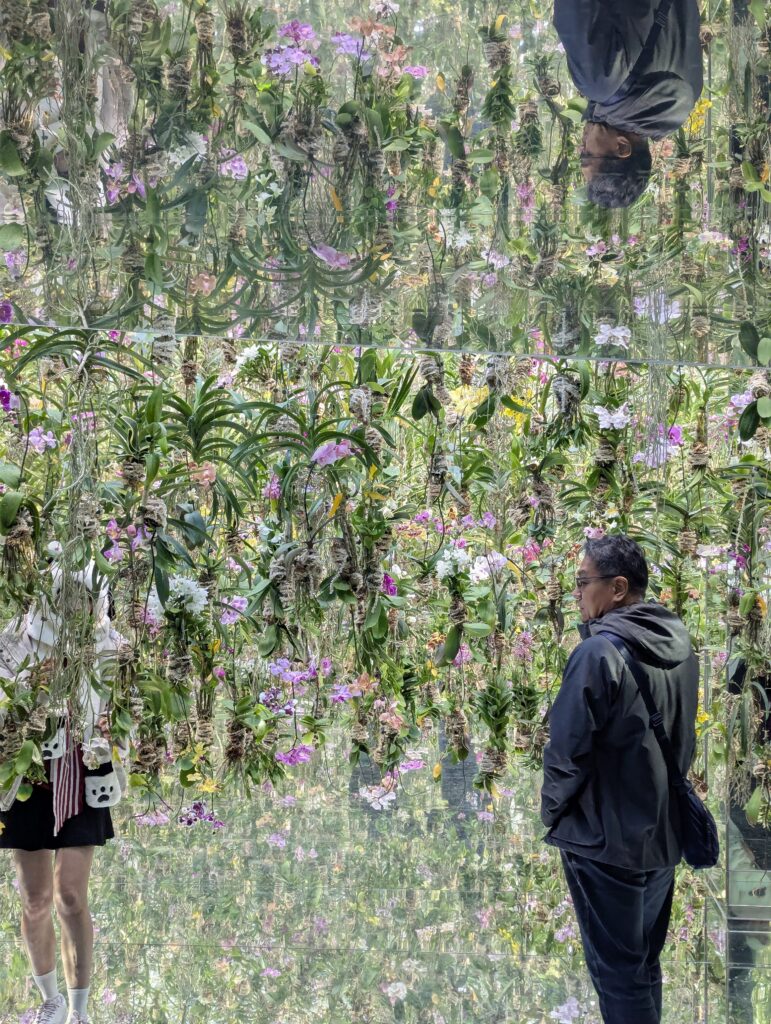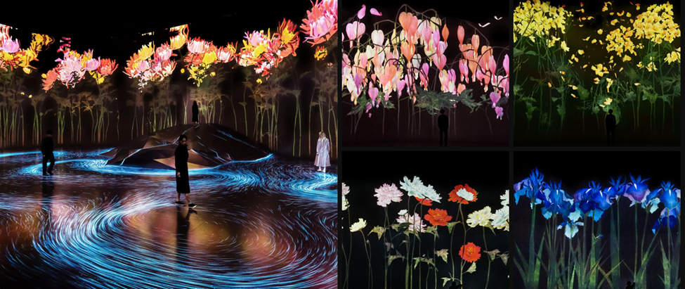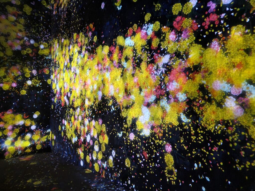 Biologist E. O. Wilson described biophilia as humanity’s deep evolutionary affinity for living systems. Flowers act as “nature bridges,” activating neural pathways associated with safety, warmth, and wellbeing. They engage sight, scent, attention, and emotion simultaneously. At teamLab, flowers are not decoration. They are active therapeutic agents – dissolving boundaries, rewarding stillness, and restoring presence through viewers’ mindfulness steps.