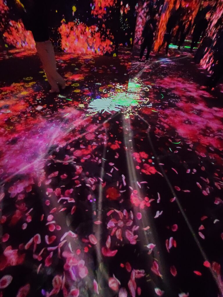teamLab’s official philosophy emphasizes immersion, embodiment, active participation, and the dissolution of boundaries between self and world. Rather than observing art, visitors enter it. Their movement shapes the environment in real time. The body becomes part of the artwork.